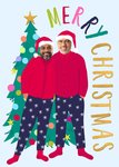Featuring an illustration of a couple standing in front of a Christmas tree wearing matching pjs and Santa hats on a blue background with 2 photo upload areas in the face holes with bold colourful typography wrapped around the couple.