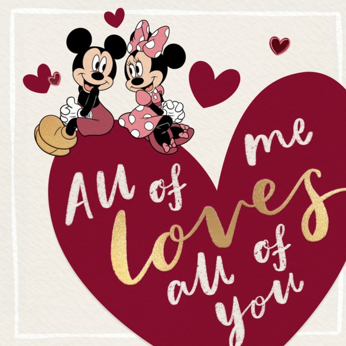 Front of card: A heartfelt design featuring Mickey Mouse and Minnie Mouse sitting on a large red heart with gold & white script text and smaller hearts on a cream background. Text reads: "All of me loves all of you".
