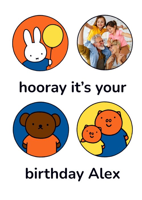 Featuring Miffy and friends, cartoon animal characters in coloured circles, as well as txt and a circular frame for your image, on a white coloured background.