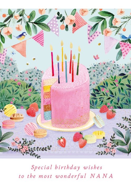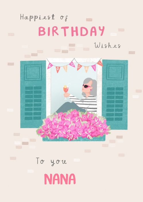 Front of card: Illustration of a woman sitting on a windowsill with sunglasses on and a drink in her hand. Bunting above her says 60 TODAY! The text reads Happiest of BIRTHDAY wishes To you NANA