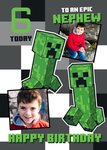 Front of card: Celebrate your nephew's 6th birthday with this epic Minecraft-themed card. Featuring Creeper characters and two areas for your photos, this card is perfect for any young Minecraft fan. Text reads: "6 Today. To an Epic Nephew. Happy Birthday."