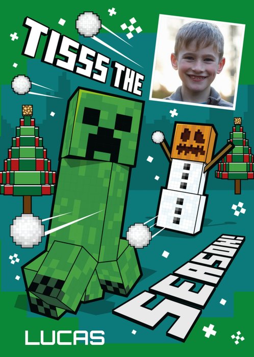 Front of card: Minecraft Tis The Season Photo Upload Christmas Card Minecraft Snowman throwing snowballs at Creeper. Personalised card. Text reads: "Tis The Season Lucas". Lucas is customisable.