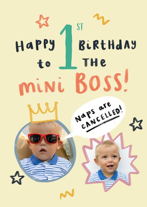 "Happy 1st Birthday to the mini boss! Naps are cancelled!" "1st" is editable.