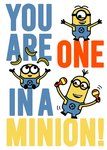 Featuring three Minions characters, one is juggling bananas, another has its arms in the air and the other is shaking maracas.