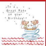 Front of card: A sweet and fun Birthday card featuring a couple of illustrated happy mice sitting in a teacup while clinking wine glasses. They are floating on a watercolour sea. There are stars in the background.