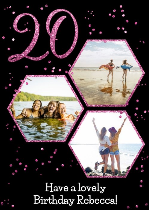Hooray For Today. Front of card: Pink background with a square photo upload frame taped at the top with illustrated cakes, gifts and candles surrounding it. Text on the card reads: "20 Today Happy 20th Birthday Granddaughter". All text is editable besides "today". Back of card contains: Hooray for Today logo in matching style.