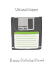 Front of card: Modern trendy retro illustrated design with a floppy disk and type font card.Text reads: "Old and Floppy Happy Birthday Steve!". Old and Floppy and Happy Birthday Steve can both be personalised.