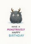 Featuring an illustration of a cute grey monster with antlers sat on a crisp white background above a playful Birthday message in black, pink, and blue text.