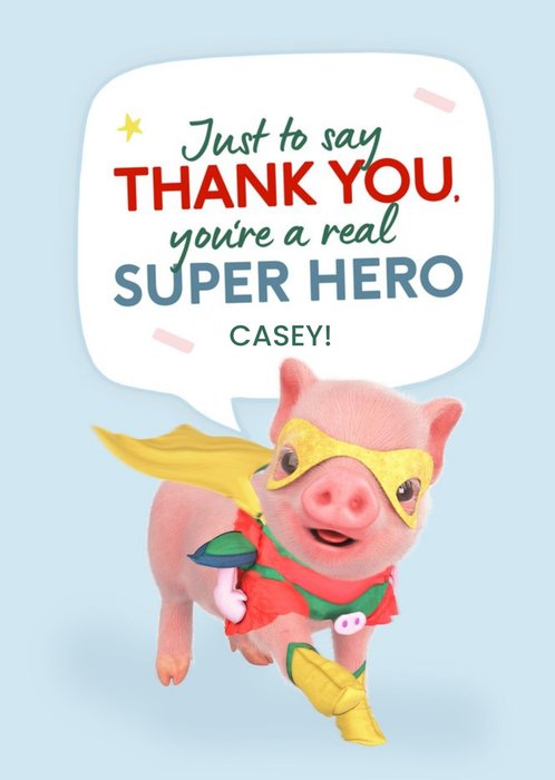 Front of card: Moonpigs Super Hero Personalised Thank You Card Cute Moonpig wearing a cape and mask with speech bubble on blue background. Personalised card. Text reads: "Just To Say Thank You You're A Real Super Hero Casey"