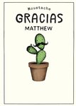 Front of card: Moustache Gracias Thank You Card Illustration of a cactus character with a moustache. Text reads: "Moustache gracias Matthew". 'Matthew' can be personalised!