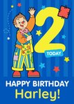 Front of card: Mr Tumble Something Special 2 Today Birthday Card Features a brightly coloured illustration of Mr Tumble stood next to a large yellow number 2 on blue stripy background. Text reads: "2 Today Happy Birthday Harley!". Name is customisable.