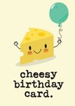 Cute Illustration of a wedge of cheese holding a balloon.Text reads: "cheesy birthday card"