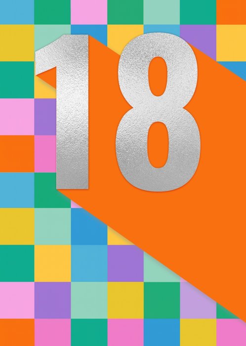 Front of card: Featuring a large silver metallic number 18 with a long orange drop shadow, on a chequered grid of squares in green, blue, yellow, pink, orange and purple.
