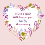 This heartfelt greeting card features a large white heart filled with colourful hand-drawn flowers, butterflies, and hearts. The message for Mum and Dad shines in playful lettering on a soft pink background, celebrating their 60th anniversary with love.