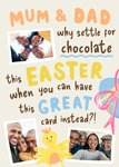 "Mum & Dad why settle for chocolate this easter when you can have this great card instead?!".