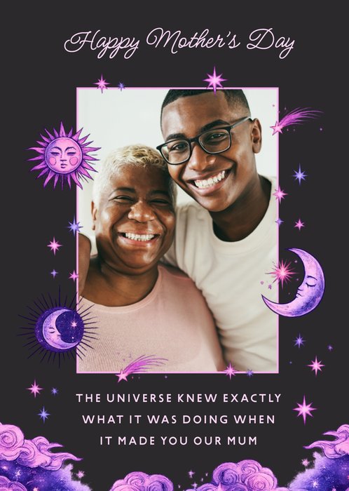 Featuring a greeting card with a large rectangular photo upload area in the centre, surrounded by purple celestial drawings of moons, stars, and clouds on a dark charcoal background.
