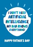 Front of card: My Dad Knows Everything! Father's Day Card Featuring colourful typography. Text reads: "I don't need artificial intelligence, my dad knows everything! Happy Father's Day".