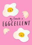 Front of card: Featuring illustrations of two fried eggs, with cute faces drawn on the yolk on a pink background. With black, handwritten style text in the middle.