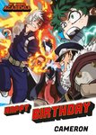 My Hero Academia characters in a collage, with a white bar across the bottom of the card, which has text on it. Text reads: "Happy Birthday Cameron". Cameron is customisable