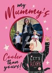 Featuring a hand painted illustration of a cool Mum in a leather jacket and heart shaped sunglasses, the back of her jacket says "let's rock" and she has a peace sign on the back of her hand. The is a central round photo frame, surrounded by hand lettered text.