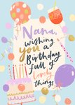 A beautifully illustrated birthday card for a nana featuring balloons, a birthday cake, gold lettering, and a spritz cocktail. The soft pastel colour scheme and handwritten-style typography add a thoughtful and cheerful touch.