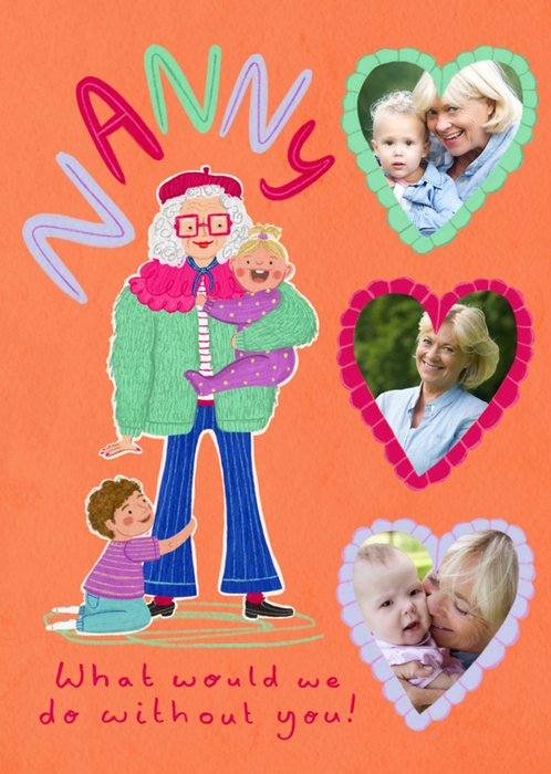 Featuring a bright & bold illustration of a nan holding a baby and a toddler holding onto her leg with colourful typography above & below and 3 heart photo frames on the right-hand side of the card, all on an orange background.