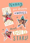 A heartfelt and playful card for Nanny, featuring multiple star-shaped photo upload frames with gold star decorations and a warm pastel colour palette. The design includes the message for showing appreciation and love for a wonderful grandmother.