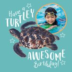 Front of card: Illustration of a turtle swimming, on a green/teal background. Surrounded by text which reads:"Have A Turtley Awesome Birthday" An orange framed circular photo upload frame is in the top right of the card behind the turtle. Rear of card: National History Museum Logo with a 'Did You Know?' paragraph in the center.