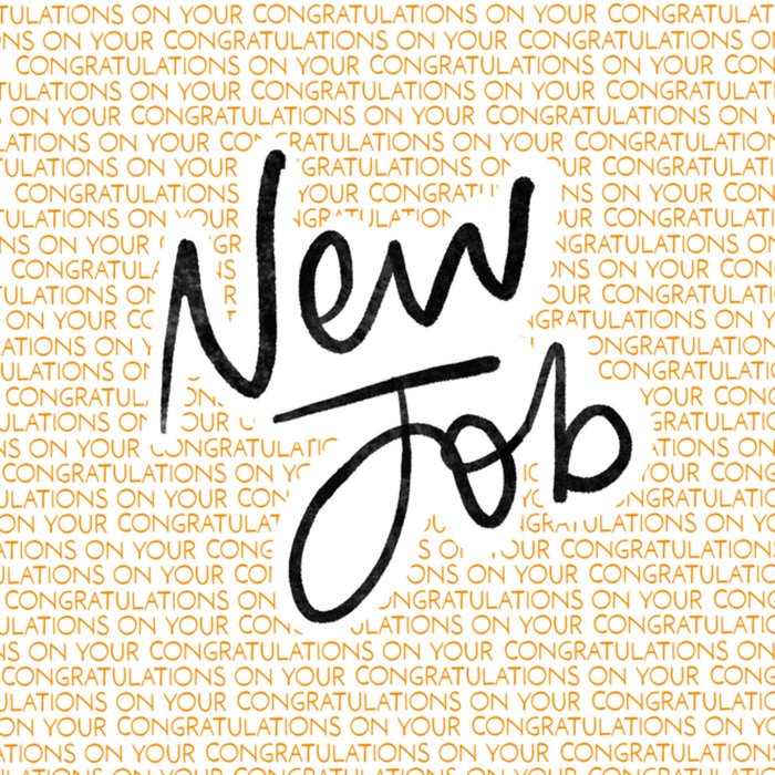 Front of card: A modern design featuring a hand-written message with a white outline, sitting on a typography pattern reading "Congratulations On Your".