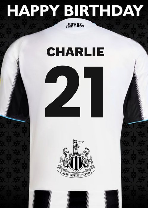 A bold black and white football-themed card featuring the back of a Newcastle United shirt. The design includes editable name and number sections, the club crest, and the phrase “Howay the Lads” beneath the collar.