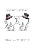 Front of card: Newlywed Congratulations Card Illustration of a two male koalas in wedding outfits. Text reads: "Congratulations to a koality couple!". ' To a koality couple!' can be personalised!