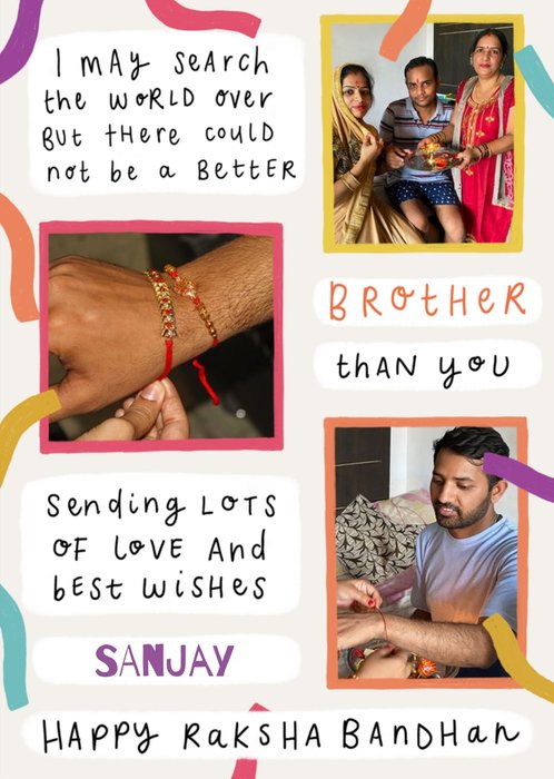 Front of card: A Colourful streamer pattern decorates this card, surrounding 3 photo upload frames. Text on card reads: "I may search the world over but there could not be a better brother than you. Sending lots of love and best wishes Sanjay. Happy Raksha Bandhan."