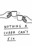 Front of card: A black and white design featuring a drawing of two hands holding cups, clinking together in a cheers action, with handdrawn text below.