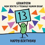 "Grandson now you're a teenage human bean! Happy Birthday". 'Grandson' and 'Happy Birthday' can be personalised!