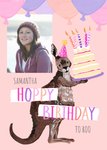 Illustrated kangaroo in party hat with cake on a pink background with balloons at top of card and photo frame