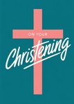 A central illustration of a pink cross with a message in white written over the top, on a blue background.