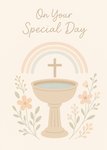 Featuring an illustration of a font framed by flowers and leaves, with a rainbow and cross above. A script message sits at the top of the card and the design is finished with a cream background.