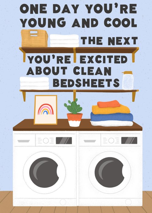 Front of card: Featuring an illustration of a laundry utility room. Text reads: "One day you're young and cool the next you're excited about clean bedsheets".