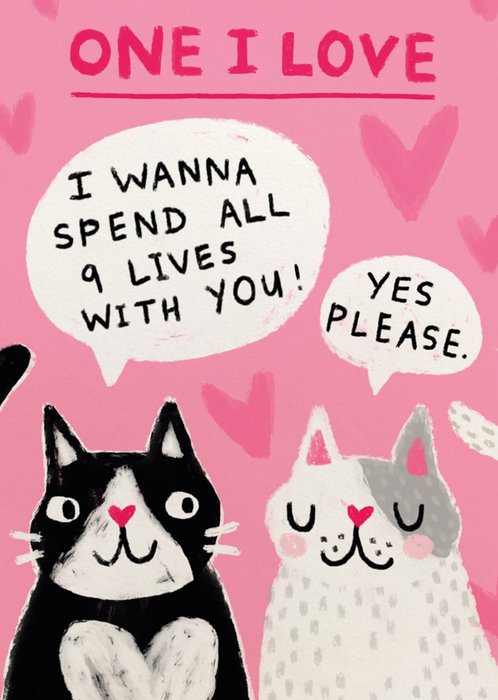 Featuring two illustrated cats with conversation bubbles, surrounded by pink hearts, on a pink coloured background.