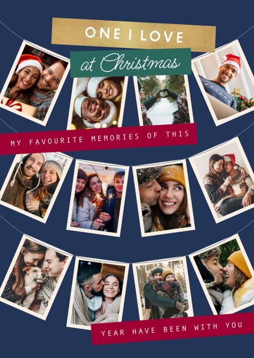 Featuring 12 rectangular photo upload frames arranged in two curved rows, resembling hanging photo garlands. The text appears across gold, green, and red banners placed between and below the photo rows. The design includes a deep navy blue background that enhances the festive and romantic theme.