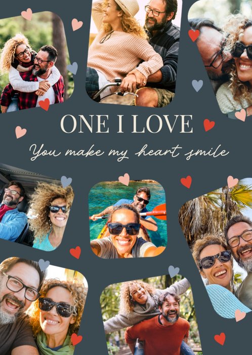 Heart-themed greeting card with rounded photo frames dotted around the edges and elegant “One I Love” wording in the centre, perfect for sharing smiles, on a deep slate blue background.