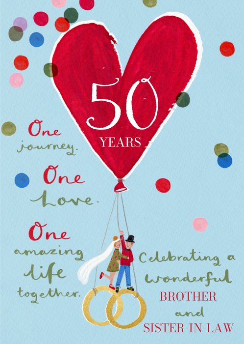 Front of card: Featuring a bold red heart balloon reading "50 Years". Suspended below are an illustrated couple standing on interlocking gold wedding rings with script effect typography throughout, all on a sky blue background with colourful confetti.
