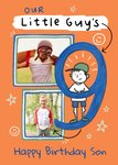 Front of card: Featuring a doodle of a boy standing within a large blue number 9, the number is overlapping two colourful photo frames. The card also features doodles of smiley faces and stars on an orange background. Text reads: "Our Little Guy's 9. Happy Birthday Son."