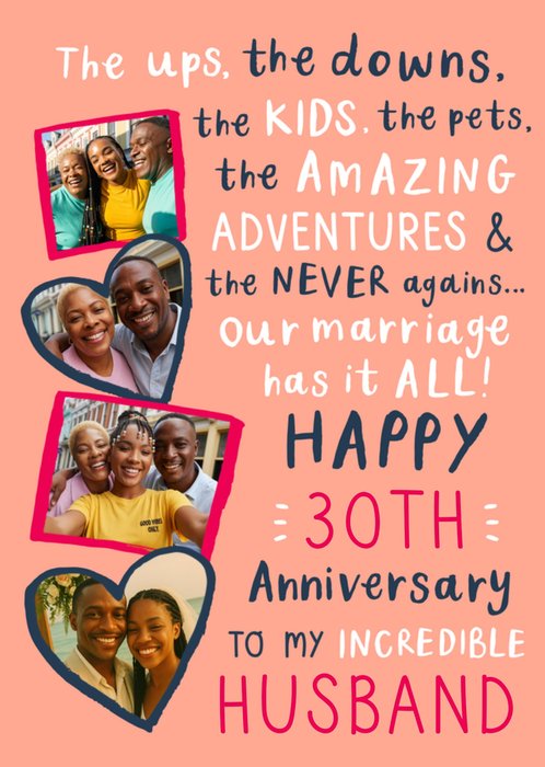 “The ups, the downs, the kids, the pets, the amazing adventures & the never agains... our marriage has it all! Happy 30th anniversary to my incredible husband”. '30th' and 'husband' can be personalised!