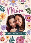 Front of card: Mother's Day Photo Upload Card Oval photo frame surrounded by colourful flowers. Text reads: "To mum happy mother's day". 'Happy mother's day' can be personalised!