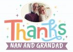 Front of card: Thank You Photo Upload Card Oval photo frame with colourful typography surrounded by colourful sparkles. Text reads: "Thanks Nan and Grandad". 'Nan and Grandad' can be personalised!
