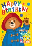 This is a greeting card featuring Paddington Bear in a red hat and blue coat waving, with colourful text, stars, dots, and squiggly lines on a bright yellow background.