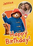 Illustration of Paddington Bear in his red hat and blue coat waving, with a tall stack of marmalade sandwiches beside him. A photo upload frame is shown in the top right corner with space for a name above. Bright yellow and orange background with marmalade jar and orange slice accents.