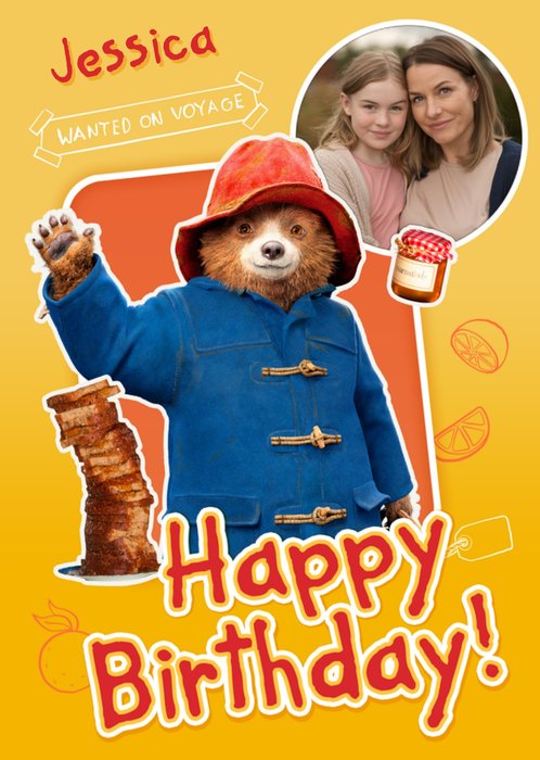 Illustration of Paddington Bear carrying a large present in front of a red London double-decker bus with bunting. A circular photo upload frame in the top left corner. Blue background with scattered polka dots.