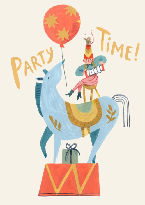 Party Time Hand Painted Illustrated Horse And Accordion Circus Entertainer Balancing Act Birthday Card
